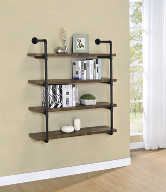 Industrial design can be elegant, as shown by this wall shelf. Plumbing pipe frame highlights the rugged utility that’s the hallmark of the style. Wall hanging adds a unique element to the piece. Incorporates four (4) open shelves for ease of storage or display. Available in a variety of finishes and widths for your specific style and space needs.