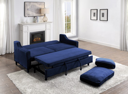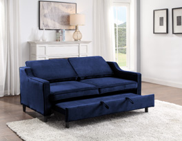 With versatility of function, the Adelia Collection presents as a unique seating option for your household. The pop-up ottoman and click-mechanism seat back of this sofa engage to create a platform for sleeping or relaxing. The seatback cushions are removable as well as reversible. Offered in Navy velvet cover for bold decorative placement and soft touch, the classic profile furthers the placement ability within a number of home environments.