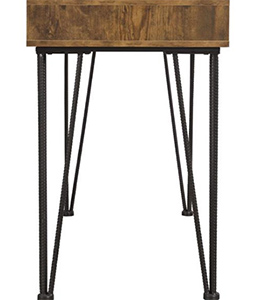 Industrial Style Writing Desk Finished In Antique Nutmeg With Metal Rebar Legs.