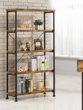 Keep important books handy with this eye-catching bookcase. Styled in an industrial motif, it blends antique nutmeg finish shelving with steel supports finished in black. Find plenty of space to store books and display accent decor. Place in a living room or family room as casual companion furniture. Four shelves and a top surface render this tall bookcase a perfect accent for an office or bedroom.
