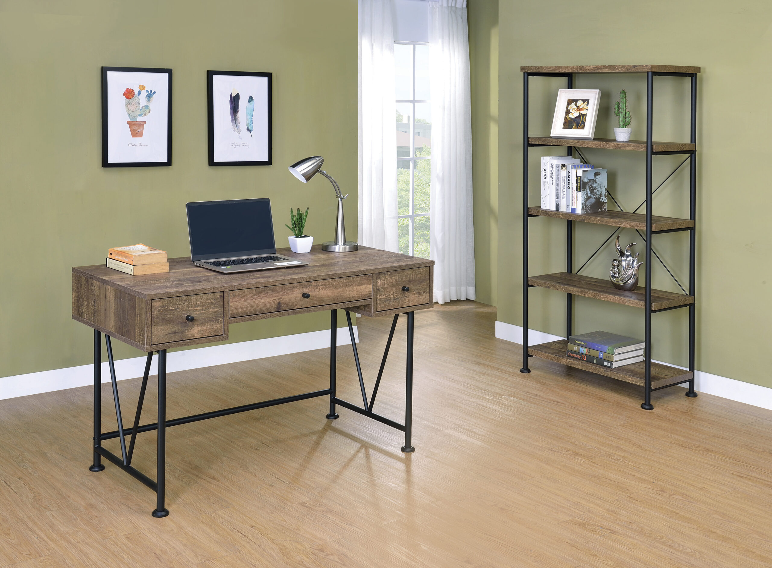 With a natural-looking, rustic oak finish, this bookcase enhances any home office with traditional flair. Its bold, dark colored metal frame is crafted into sleek, simple lines for an appealing silhouette. An x-shaped accent in the back is an eye-catching accent to its simple design. With four convenient shelves, it offers ample storage space. This versatile bookcase is ideal for any home with a classic decor style.