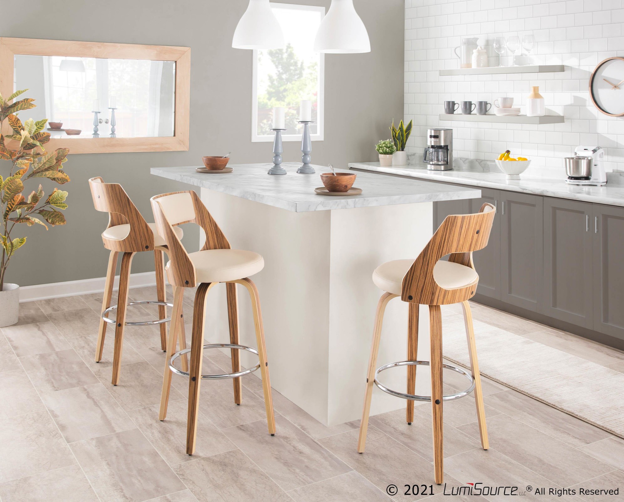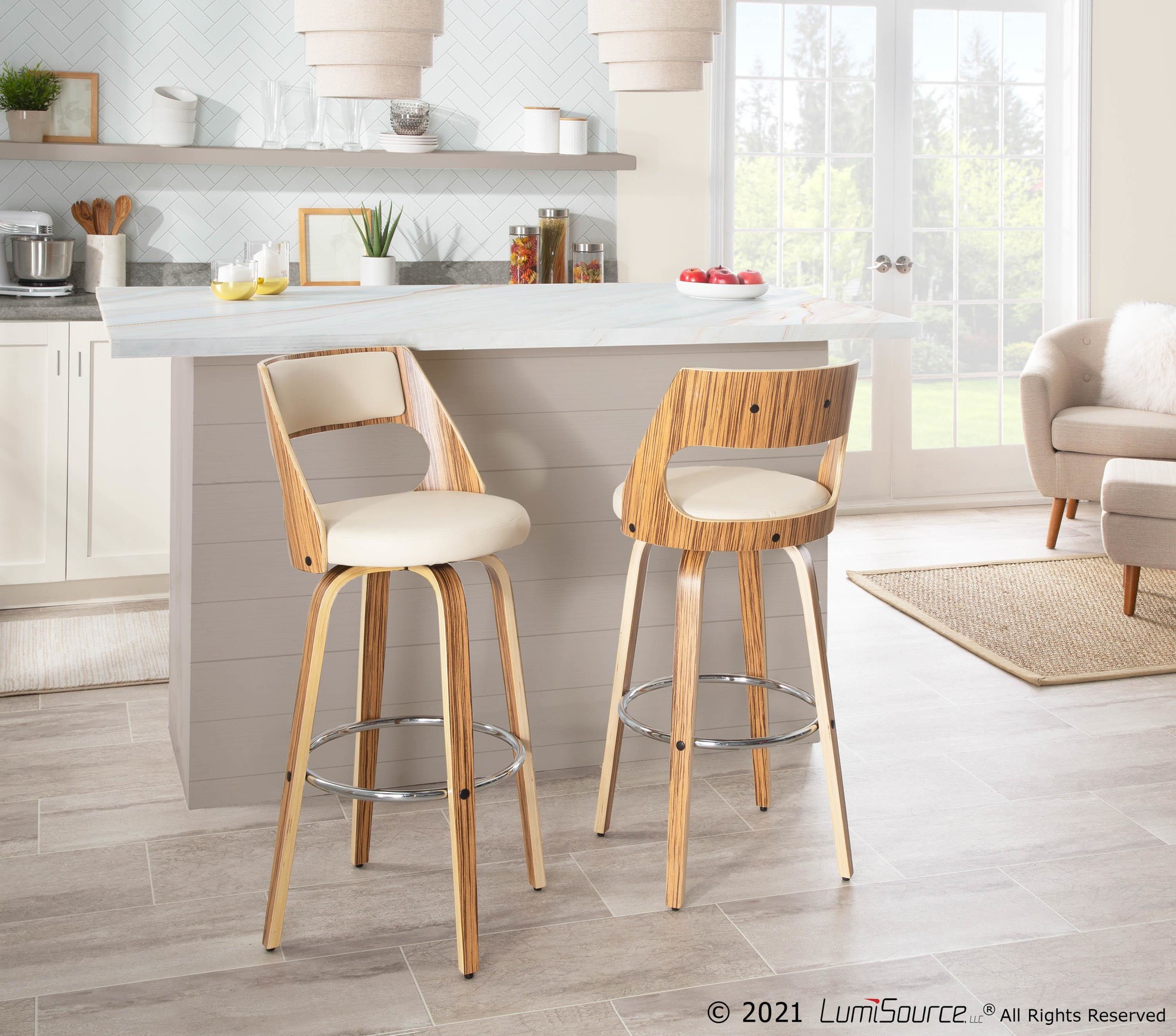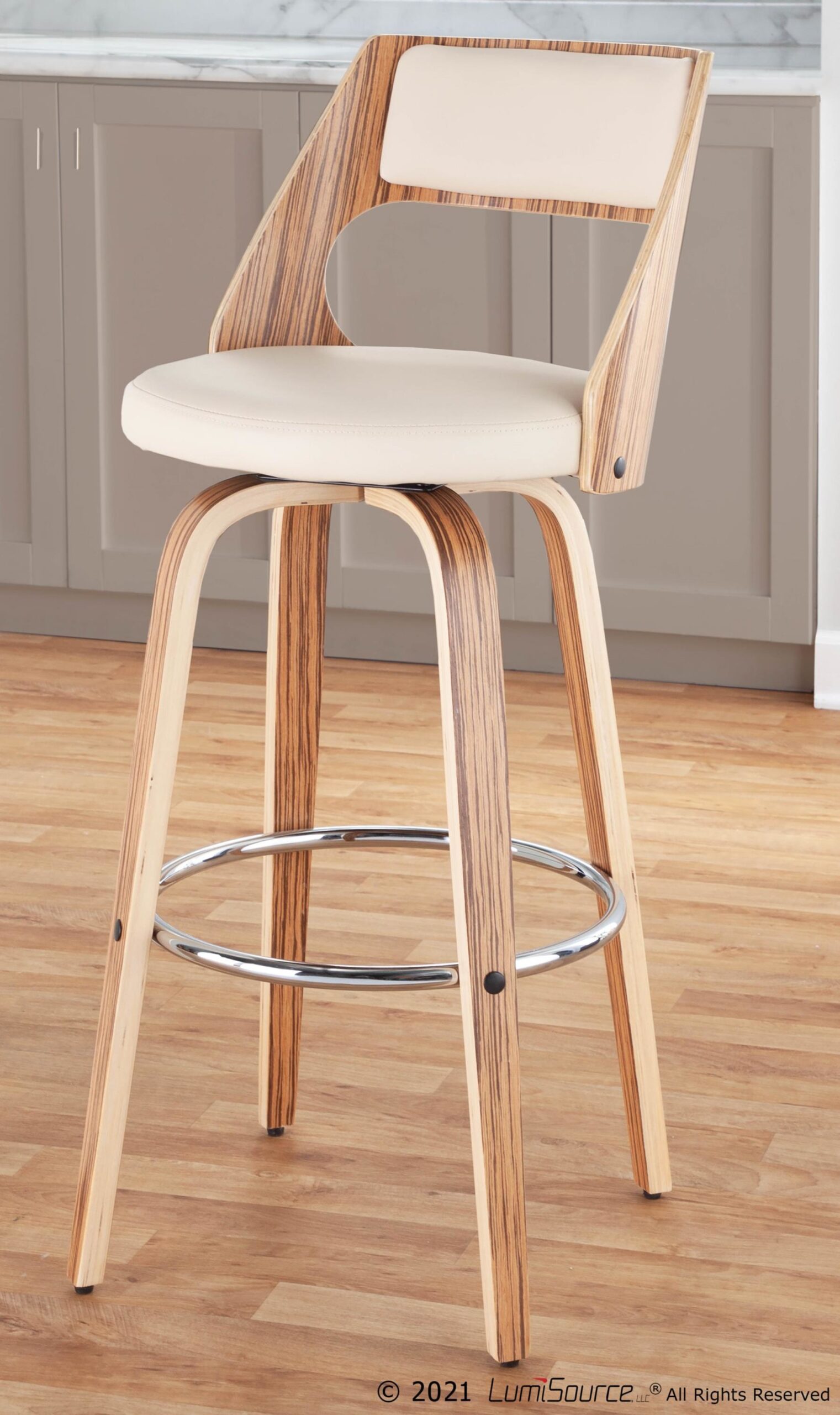 Cecina 30” Fixed Height Barstool – Zebra Wood, Cream PU, Chrome – Set of 2