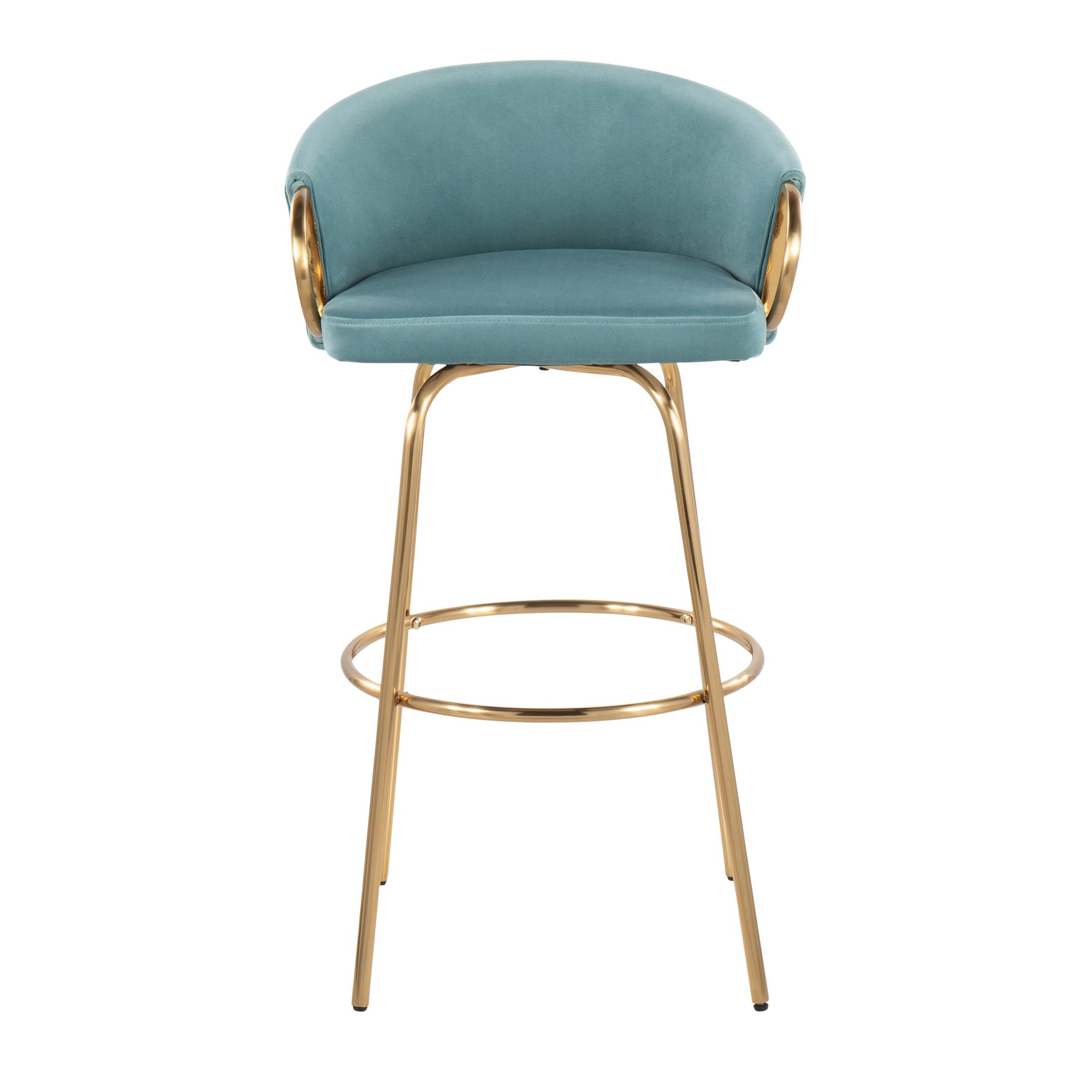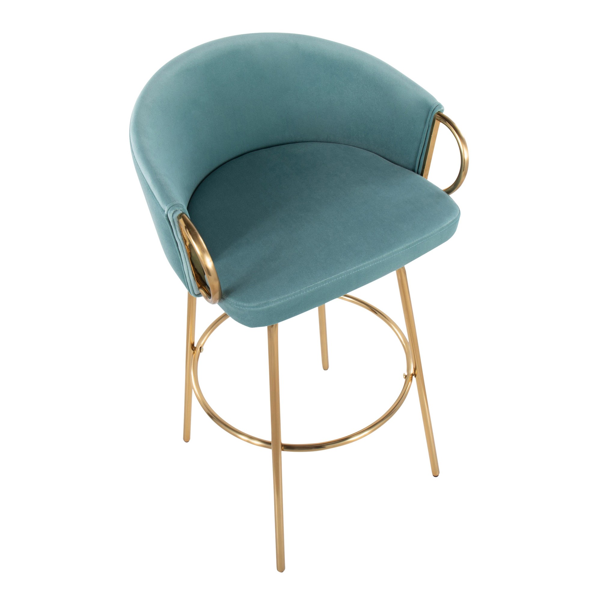 Claire 30″ Fixed Height Barstool – Gold Metal, Light Blue Velvet – Set of 2