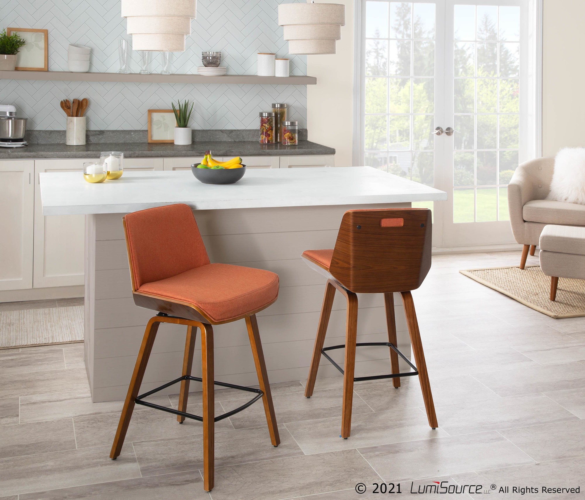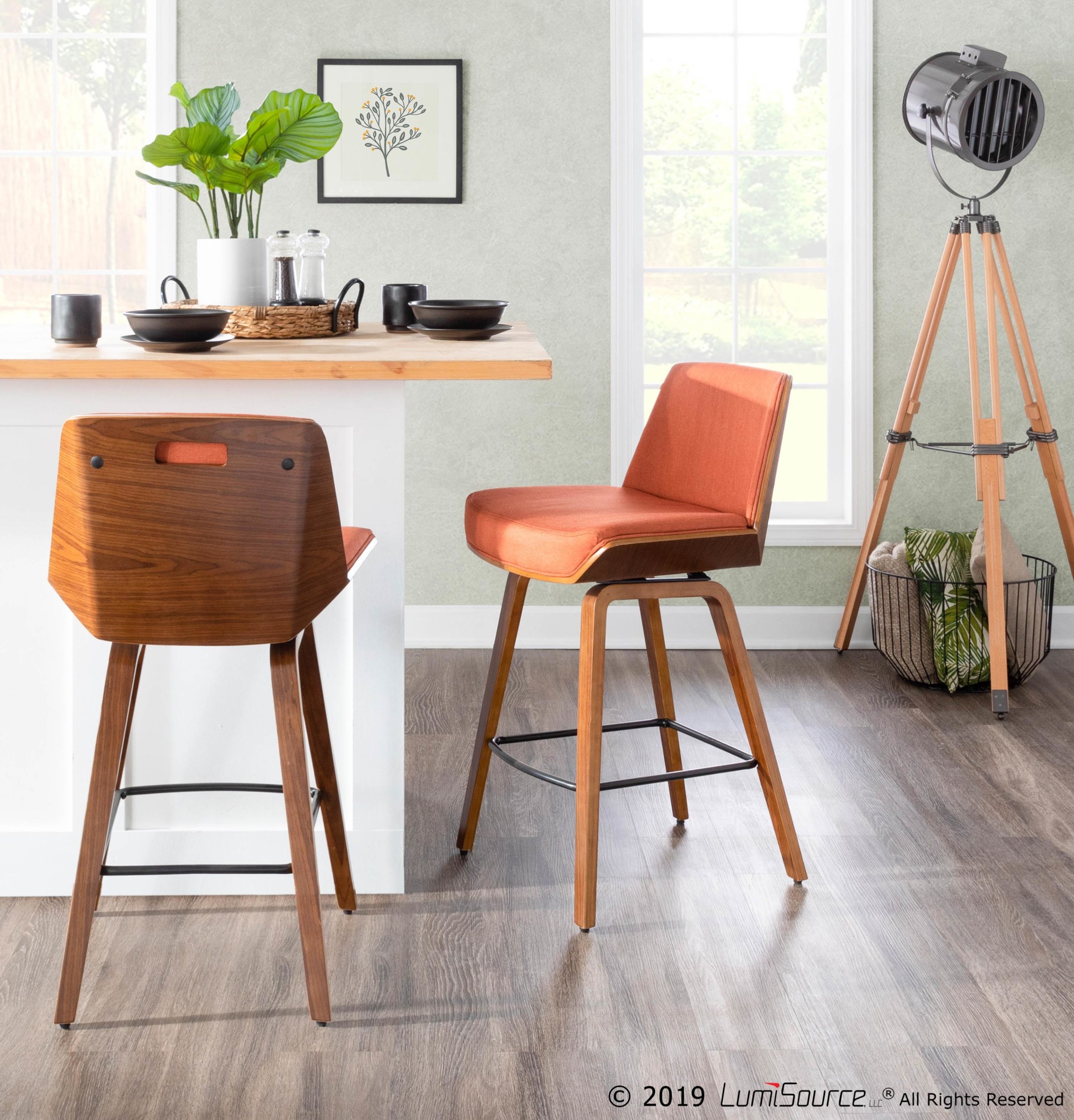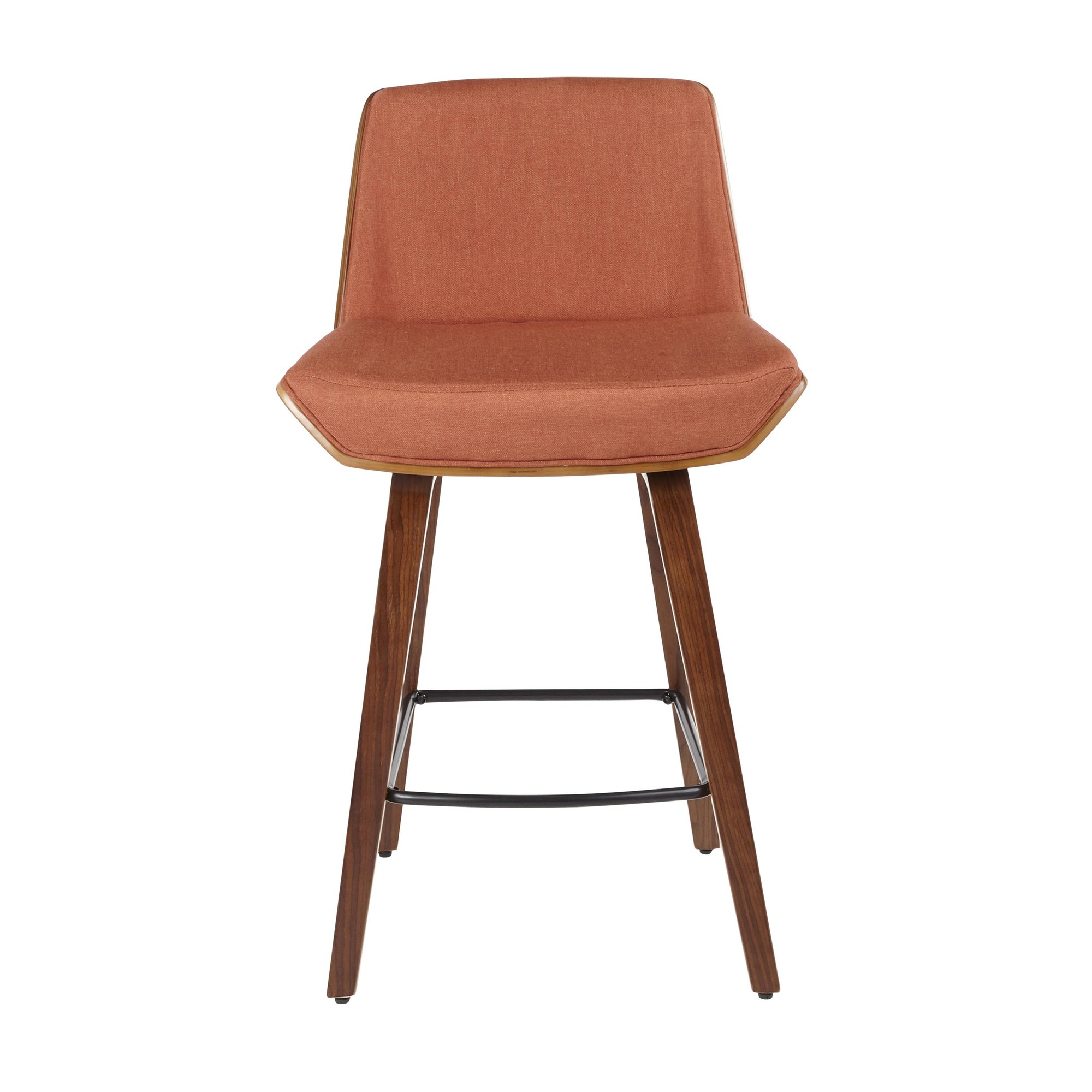 Home / Dining Room / Chairs, Stools, and Benches / Corazza Counter Stool – Walnut Wood, Orange Fabric, Black Metal