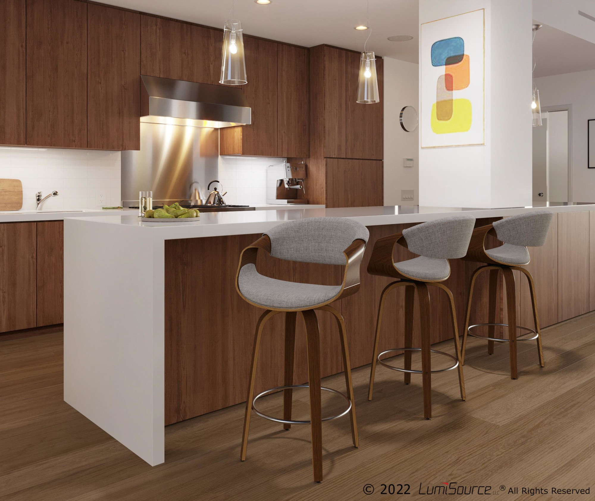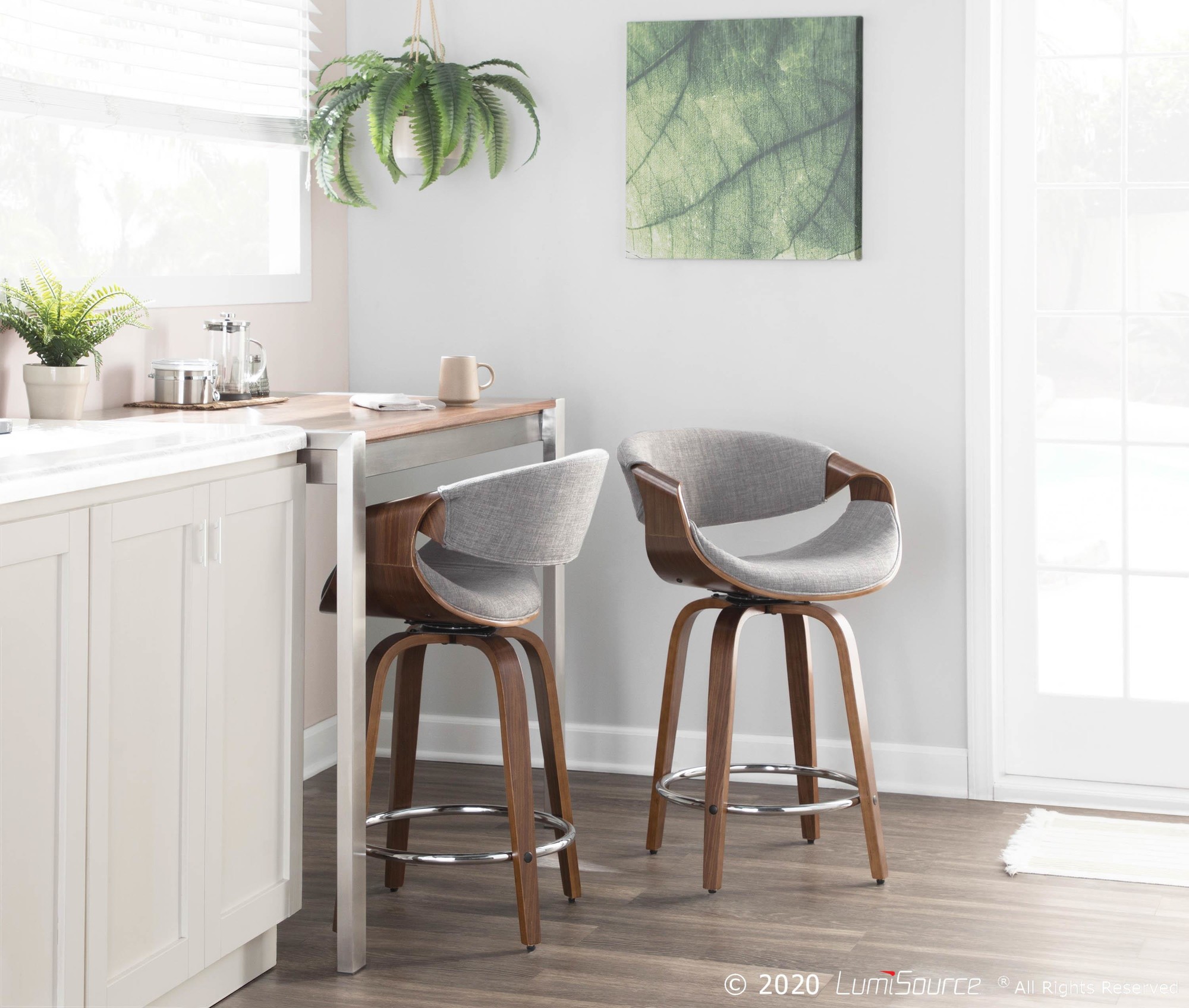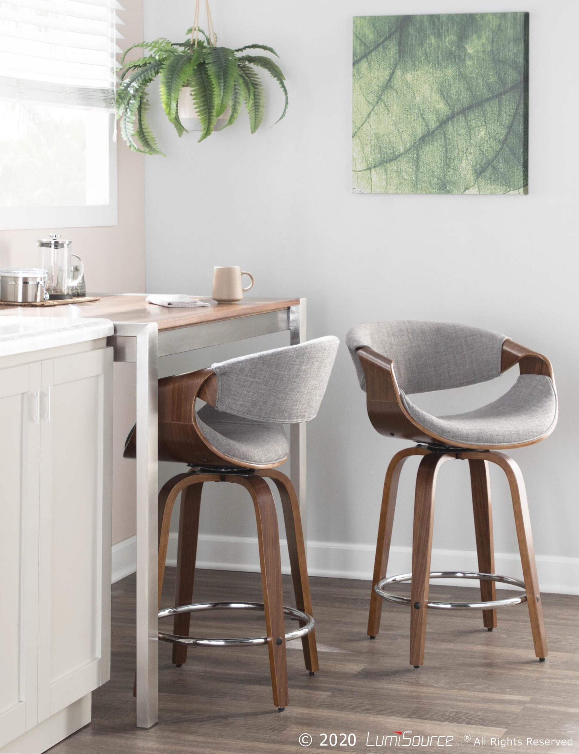 Home / Dining Room / Chairs, Stools, and Benches / Curvini 24” Fixed Height Counter Stool – Walnut Wood, Light Grey Fabric, Chrome – Set of 2