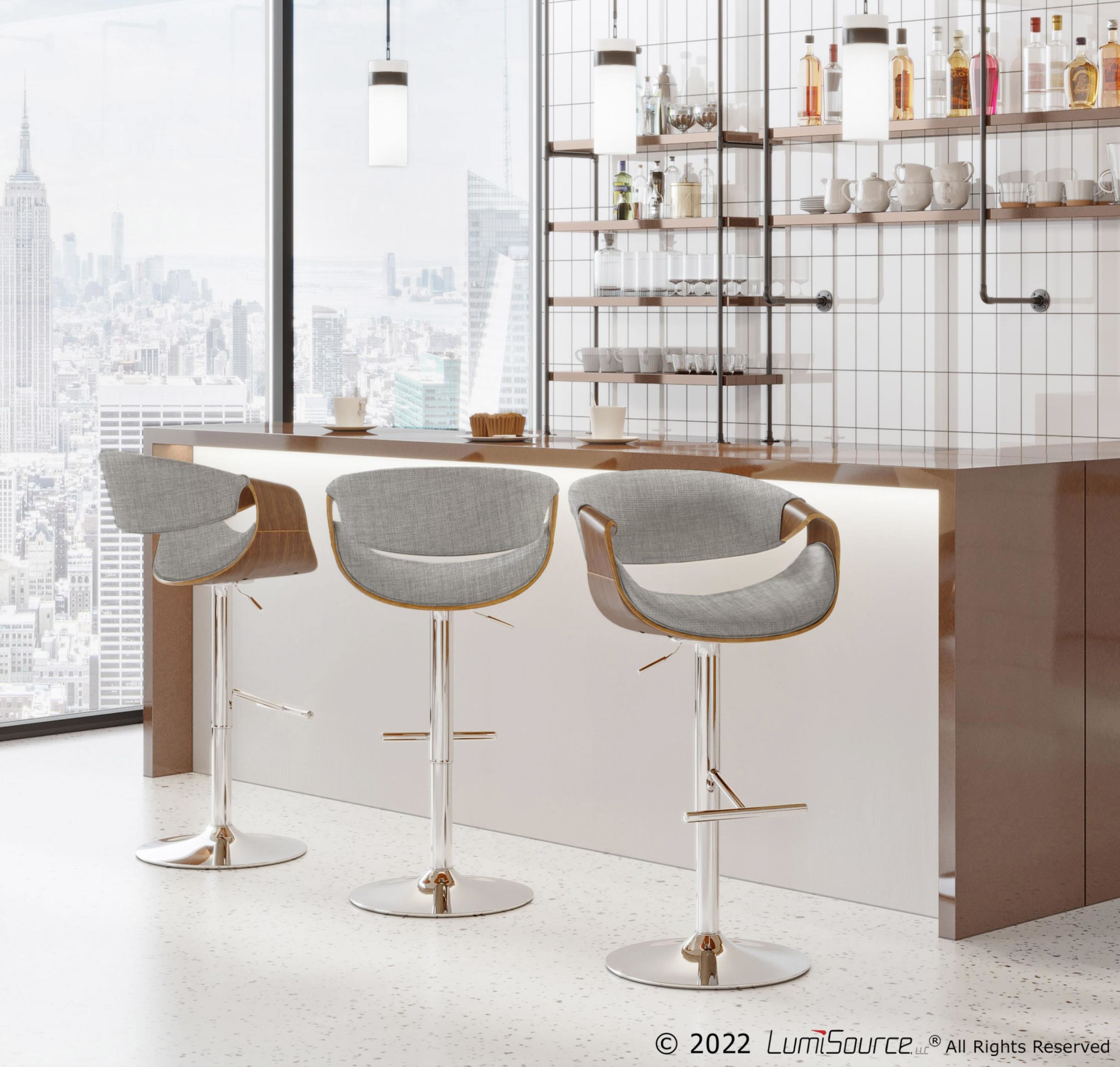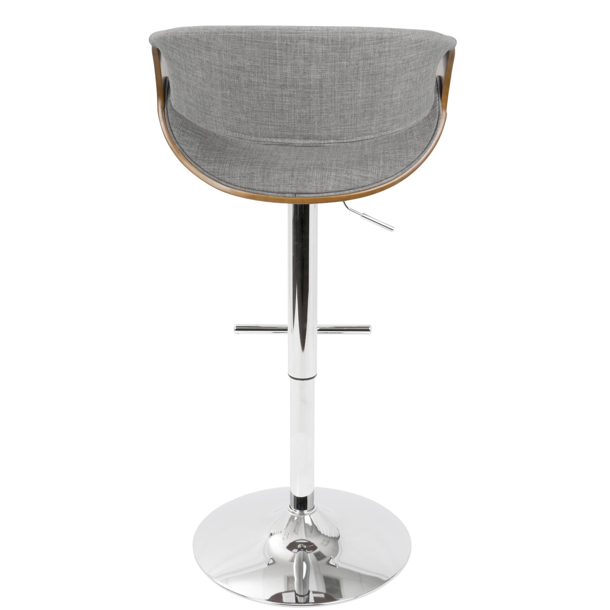 Curvo Barstool – Chrome, Walnut Wood, Light Grey Fabric