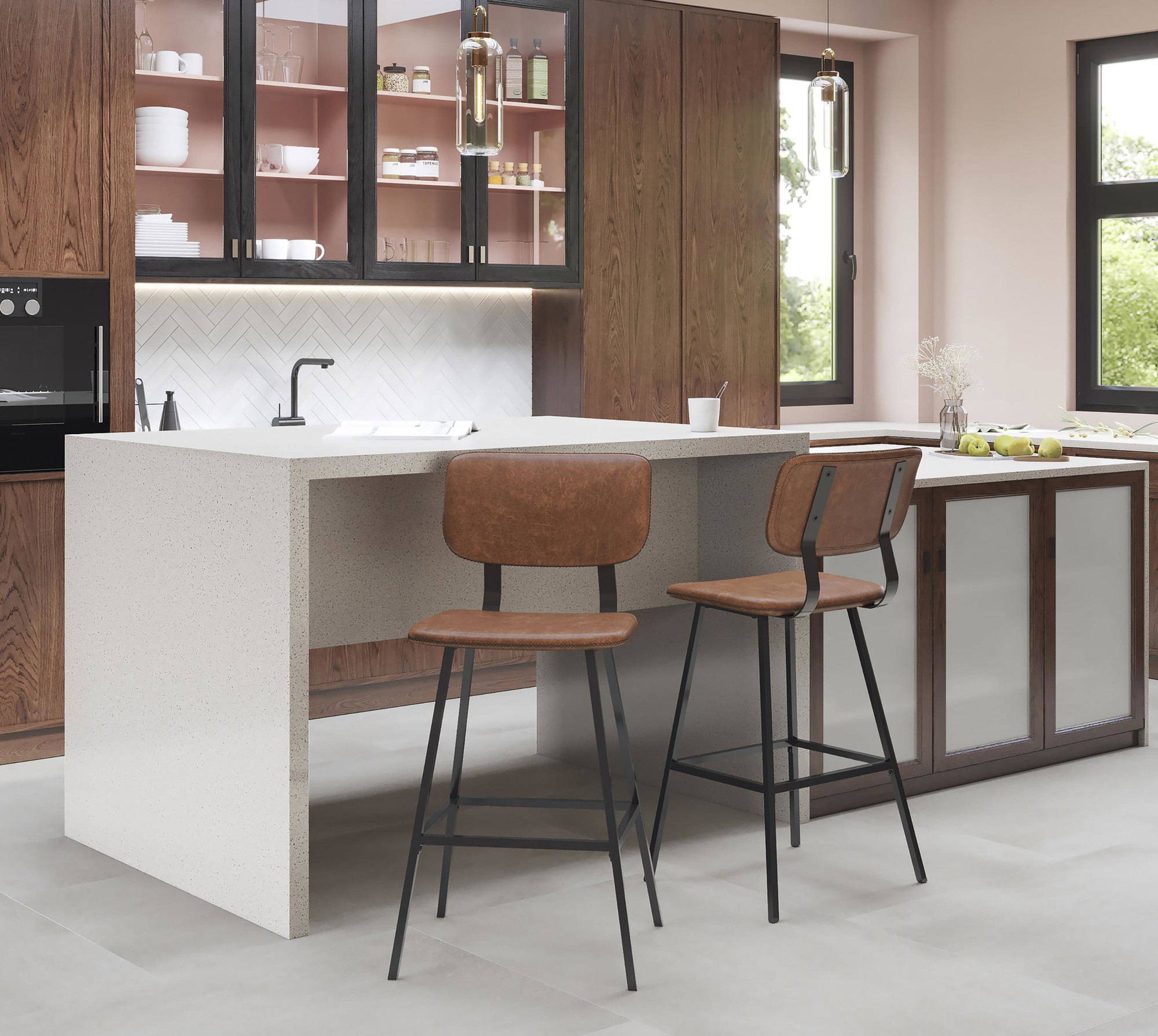 Foundry Barstool – Black Metal, Cognac PU, Brown Zig Zag Stitching – Set of 2
