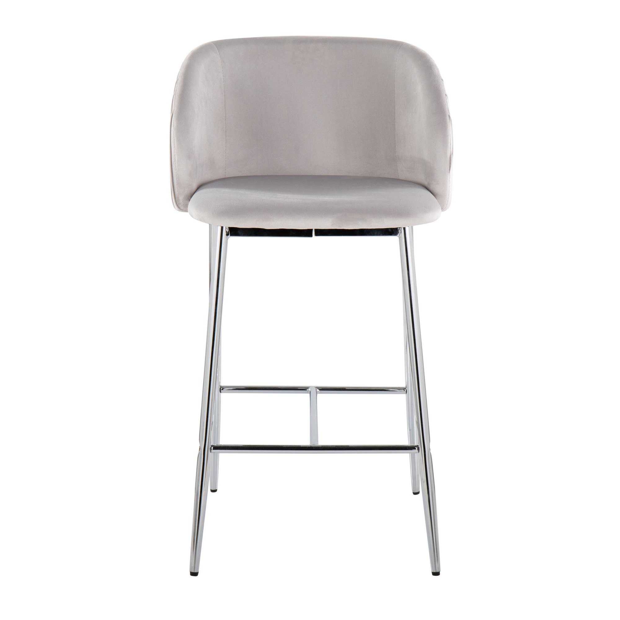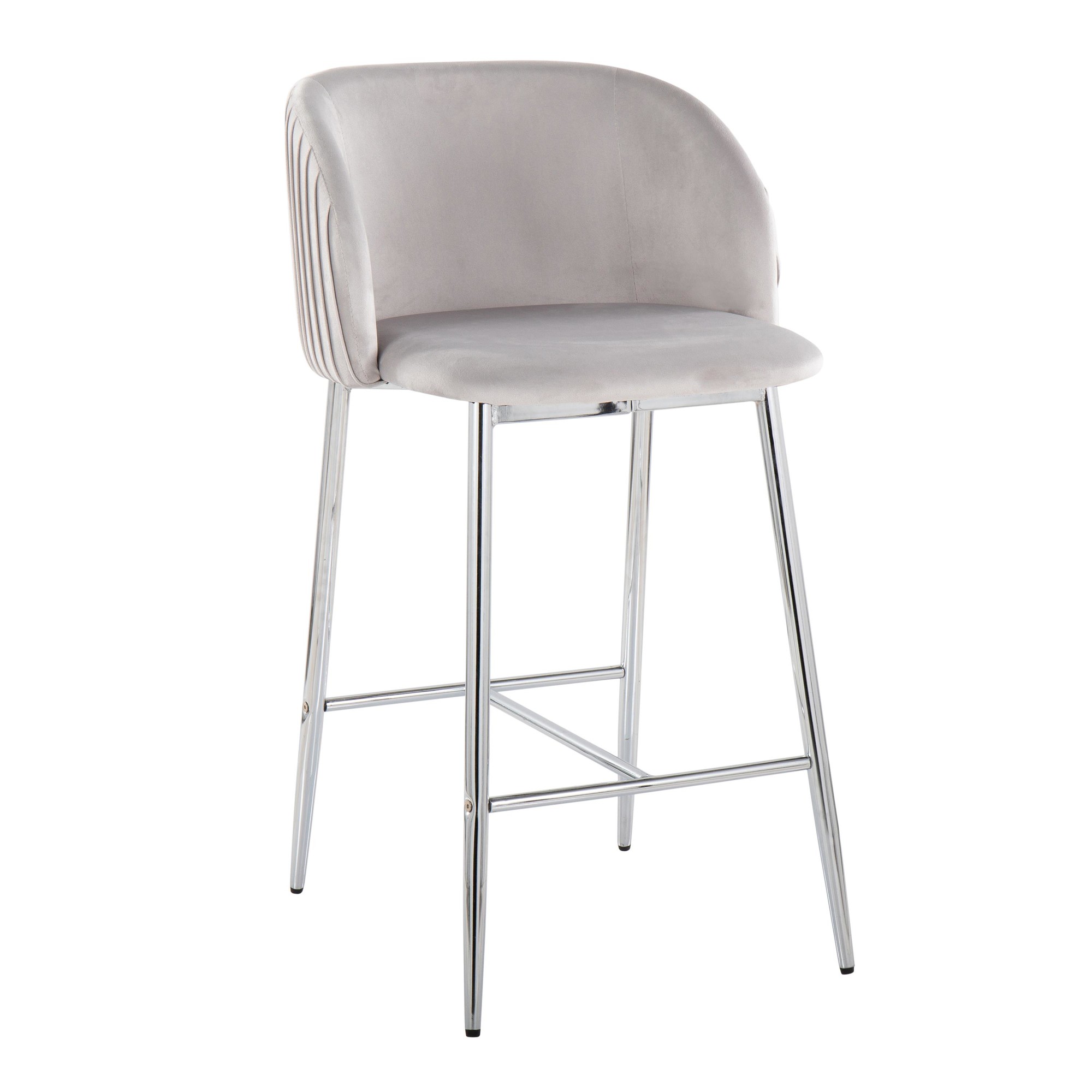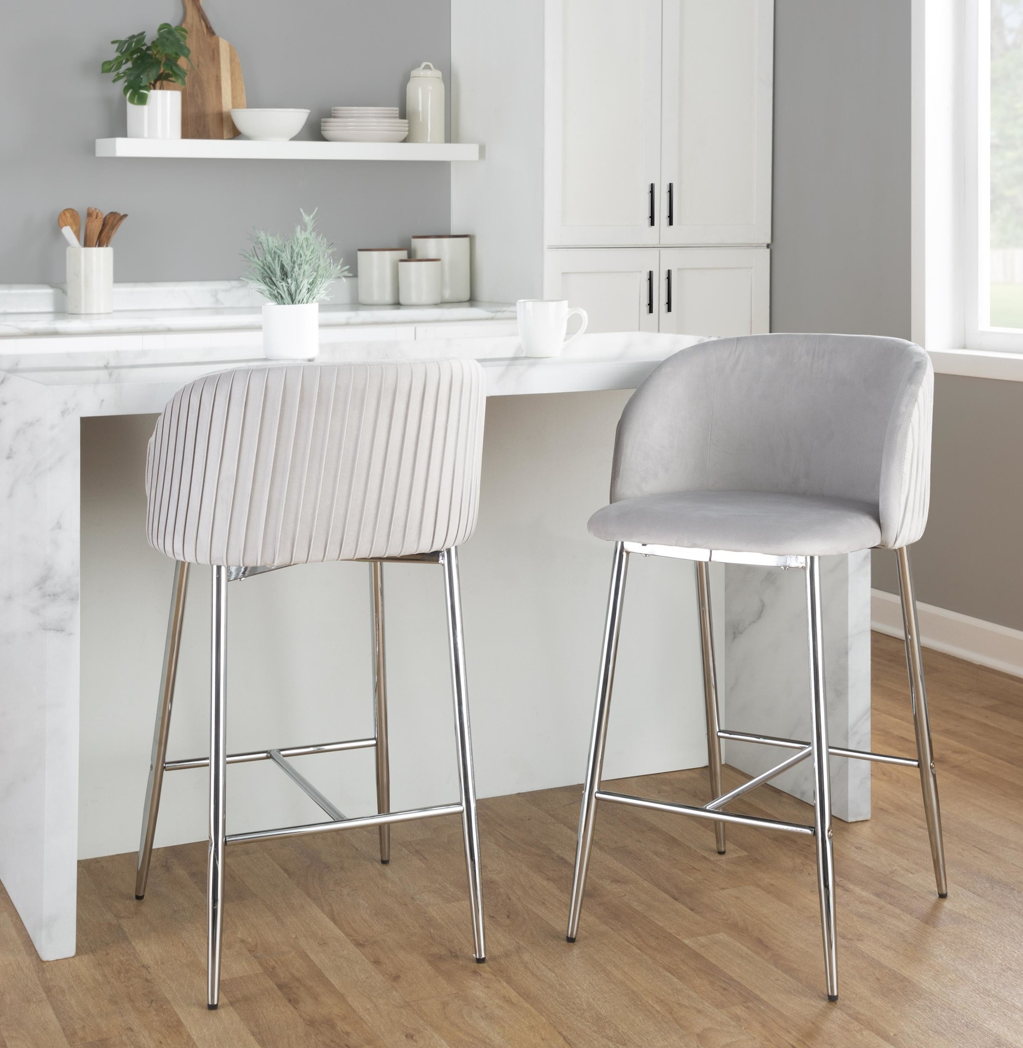 Fran Pleated Fixed-Height Counter Stool – Chrome Metal, Silver Velvet – Set of 2