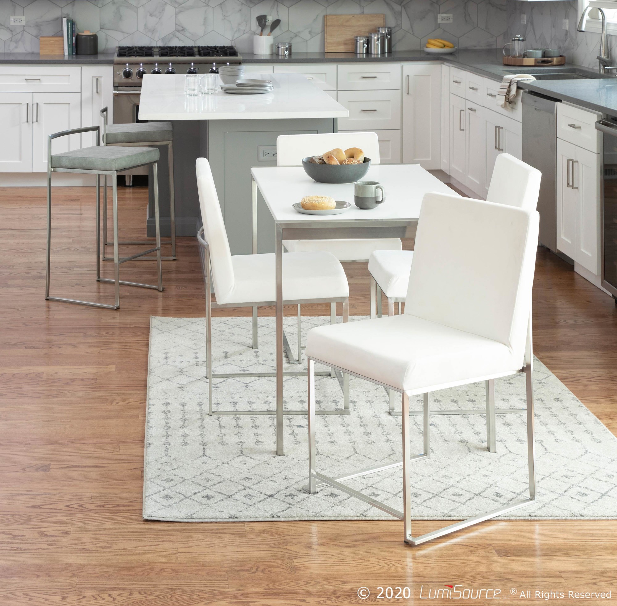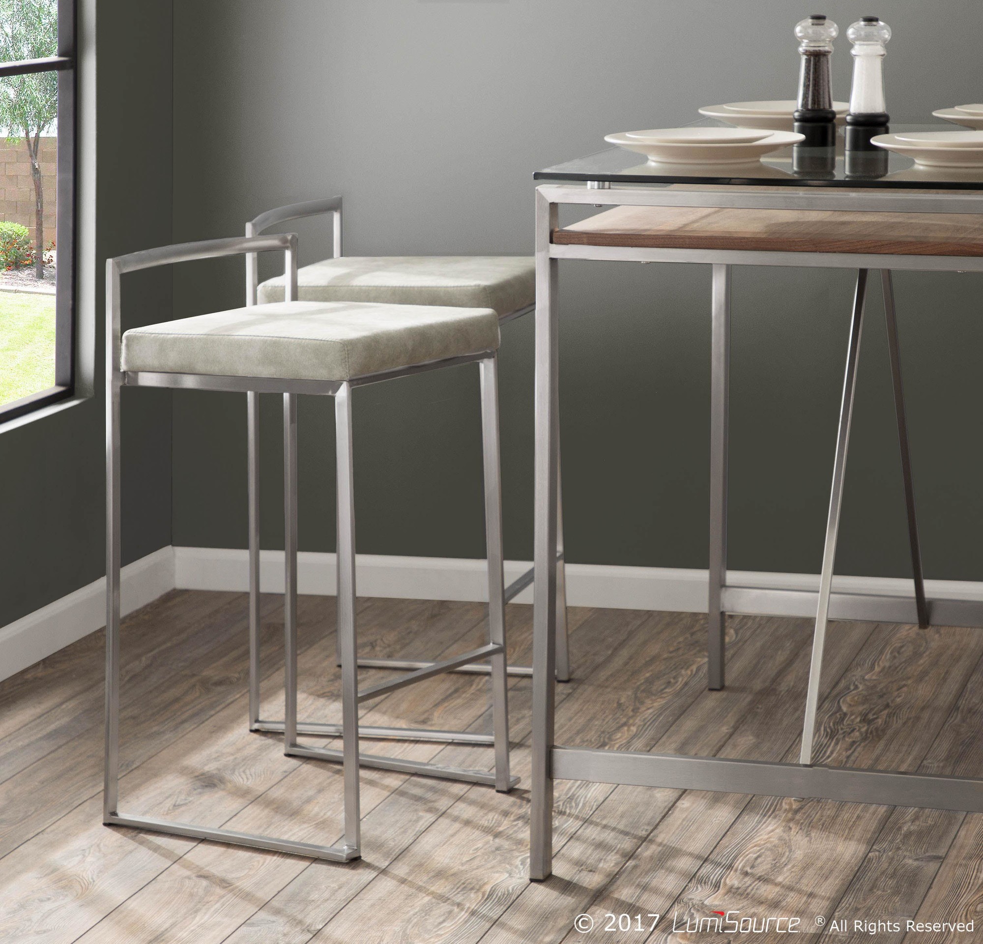 Fuji Counter Stool – Stainless Steel, Light Grey Cowboy Fabric – Set of 2