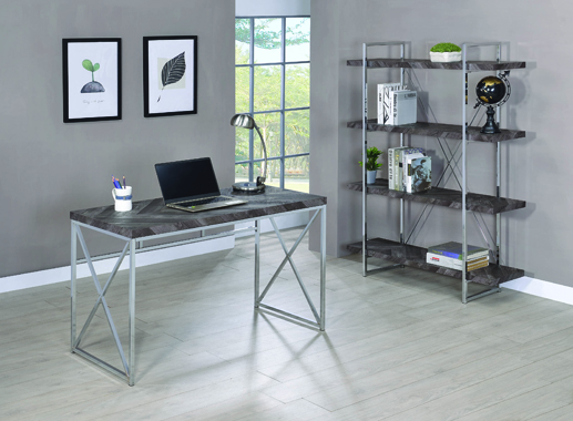 With a chic, simple silhouette, this wooden writing desk lends understated glamour to any space. Its metal base features sleek, straight lines and bold, X-shaped accents. A shimmering chrome finish adds a brilliant infusion of polished shine. Its wooden surface boasts an eye-catching, rustic grey herringbone finish for a touch of artful appeal. Place this contemporary writing desk in a living room, den, or home office to create an appealing, minimalist look.