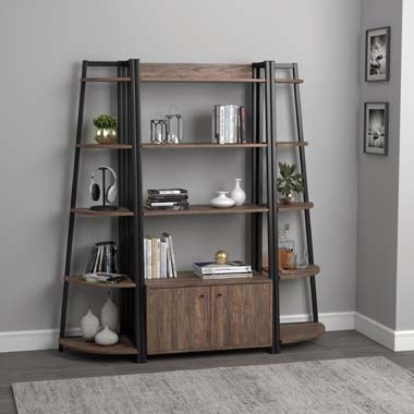 Ample storage options make this transitional bookcase a must-have for any home. Its spacious design features four tiers of shelving and a two-door cabinet with a divider inside. Its frame is comprised of sleek, straight lines made with durable metal in a bold, black finish. The shelves and cabinet are treated to a classic aged walnut finish for a tasteful and timeless look. This stylish piece is available as a single unit or as a three-piece set for a variety of options to organize your space.