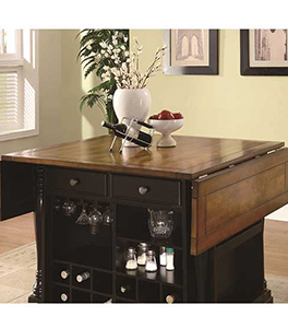The country cottage styling of this large scale kitchen island will give your home a custom feel at an affordable price. The spacious island features a black finish for the base with tons of built-in organization including cabinets, drawers, wine storage, hanging stemware storage and a spice rack. The cherry finish top has drop leaves at each end to extend the table from 42 to 66 inches long. Fold them down to save space for an efficient kitchen workflow or rise them for a food preparation space. With the leaves up, the island is also place to pull up bar stools for breakfast or a casual meal. The turned columns add to the impressive style of this versatile piece.