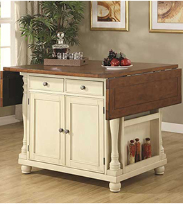 The country cottage styling of this large scale kitchen island will give your home a custom feel at an affordable price. The spacious island features a buttermilk colored finish for the base with tons of built-in organization including cabinets, drawers, wine storage, hanging stemware storage and a spice rack. The cherry finish top has drop leaves at each end to extend the table from 42 to 66 inches long. Fold them down to save space for an efficient kitchen workflow or rise them for a food preparation space. With the leaves up, the island is also place to pull up bar stools for breakfast or a casual meal. The turned columns add to the impressive style of this versatile piece.