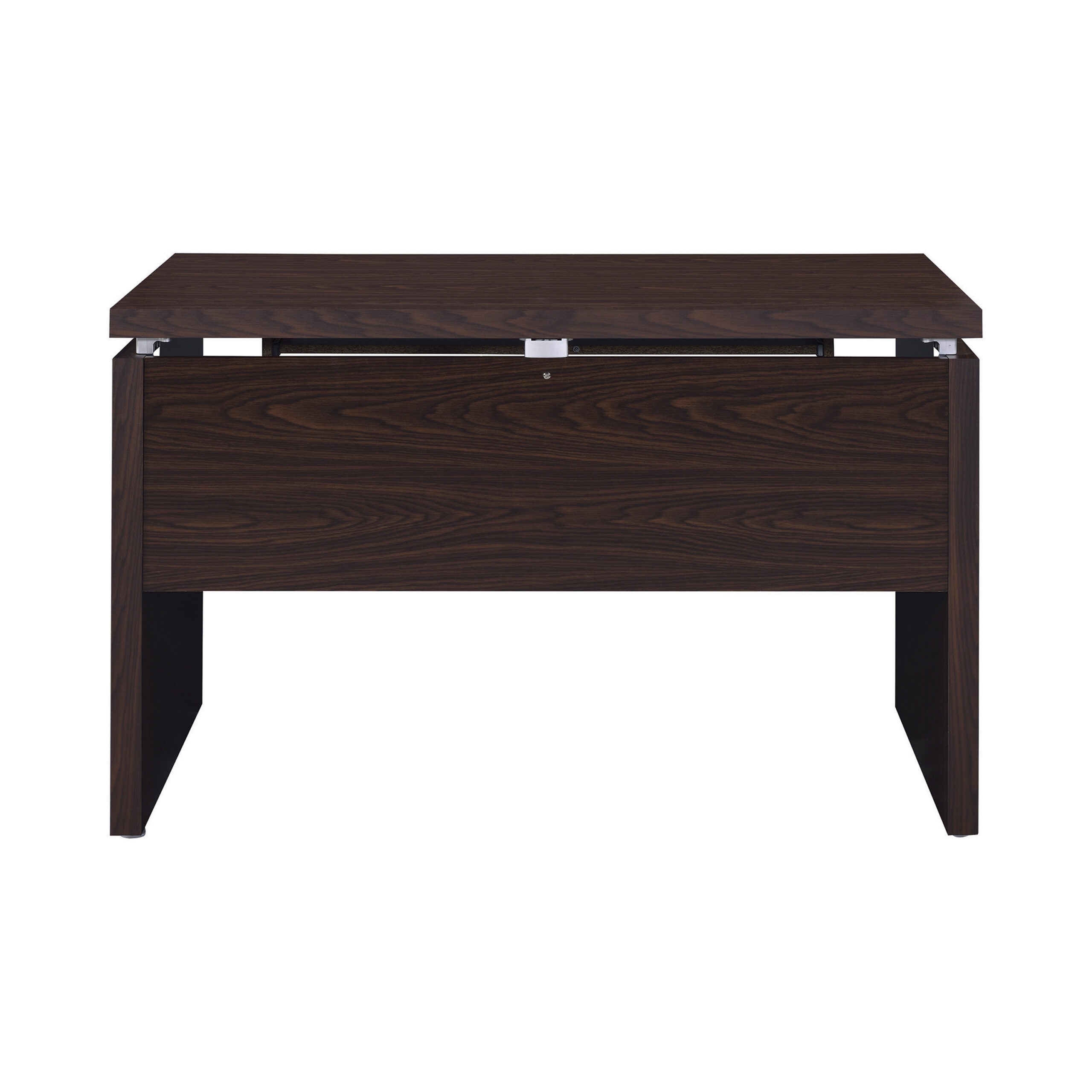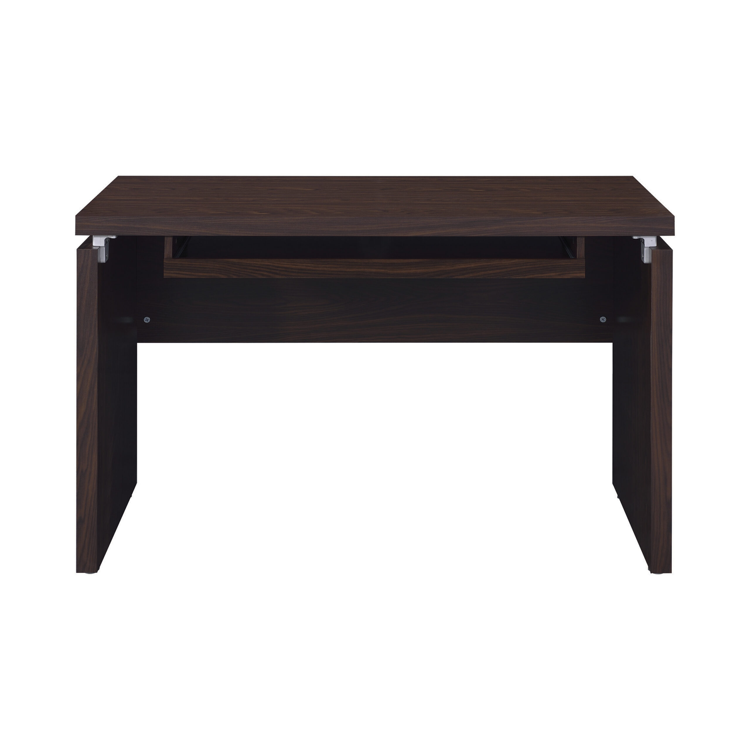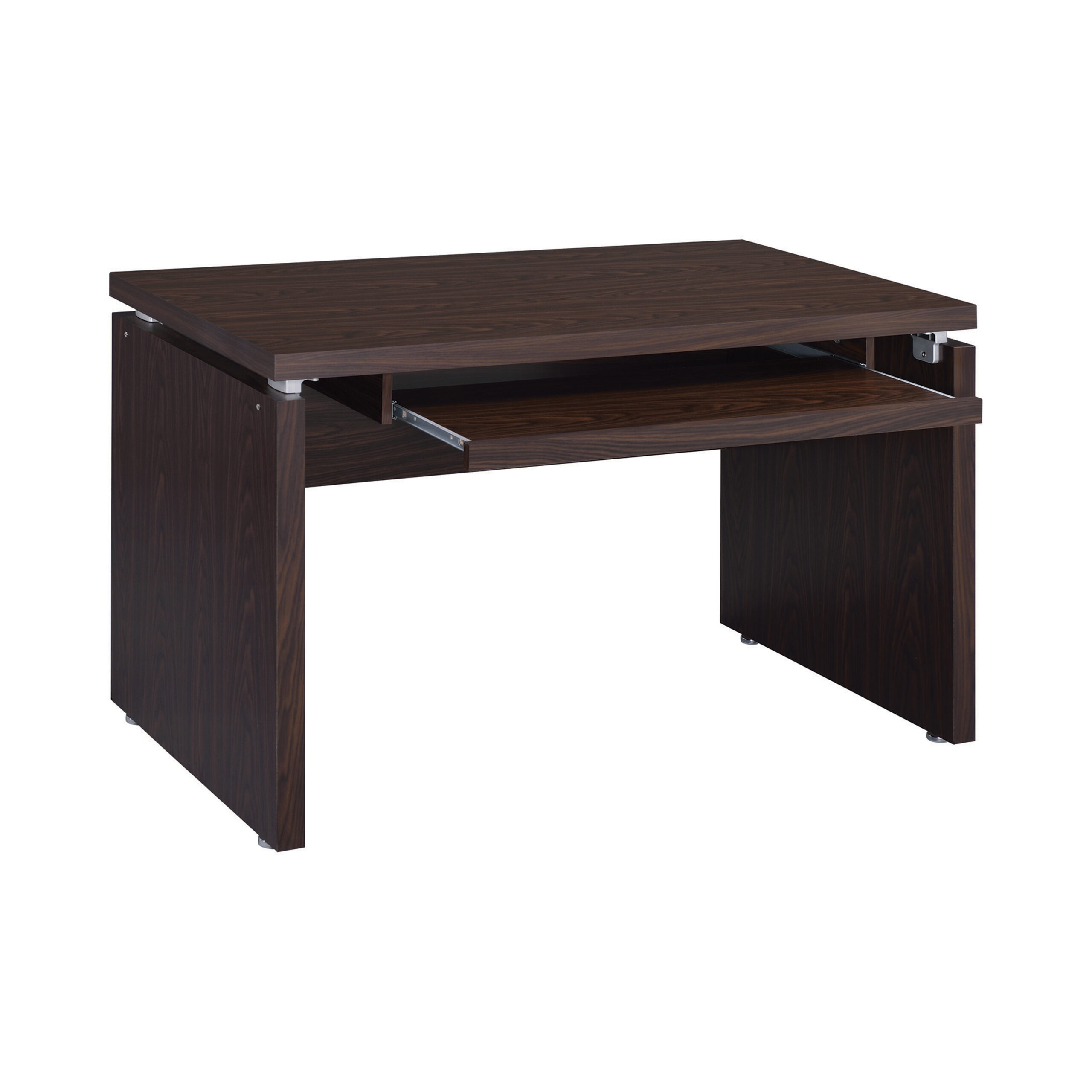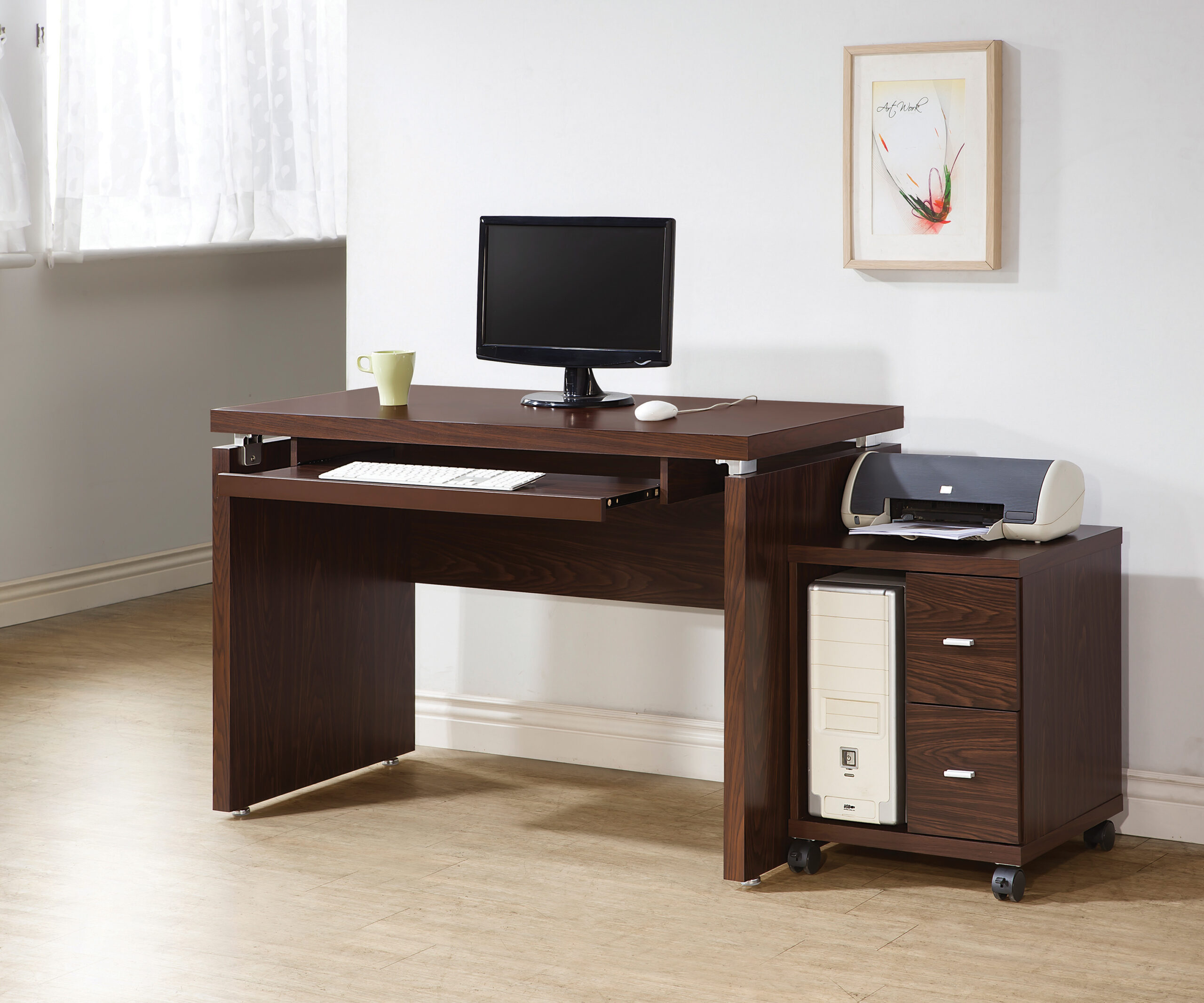 Linear design elements team up to create a basic yet beautiful staple. Making tasks simple and stylish, this computer desk offers a one-stop venue for keyboarding and completing tasks. A floating top creates separation space for clearance on a keyboard drawer. A medium oak finish adds a lovely touch. This computer desk offers space-saving convenience for a transitional bedroom or home office.